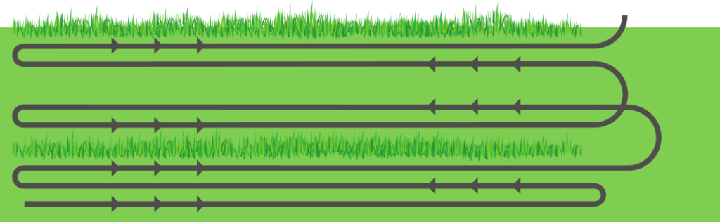 Zum Schutz der Kleintiere ist es empfehlenswert, zu den Rückzugsstreifen hin zu mähen (siehe Pfeilrichtung im Bild unten). Die Kleintiere fliehen vor dem Mähwerk und gelangen auf diese Weise in die Rückzugsstreifen, wo sie die Ernte überleben.